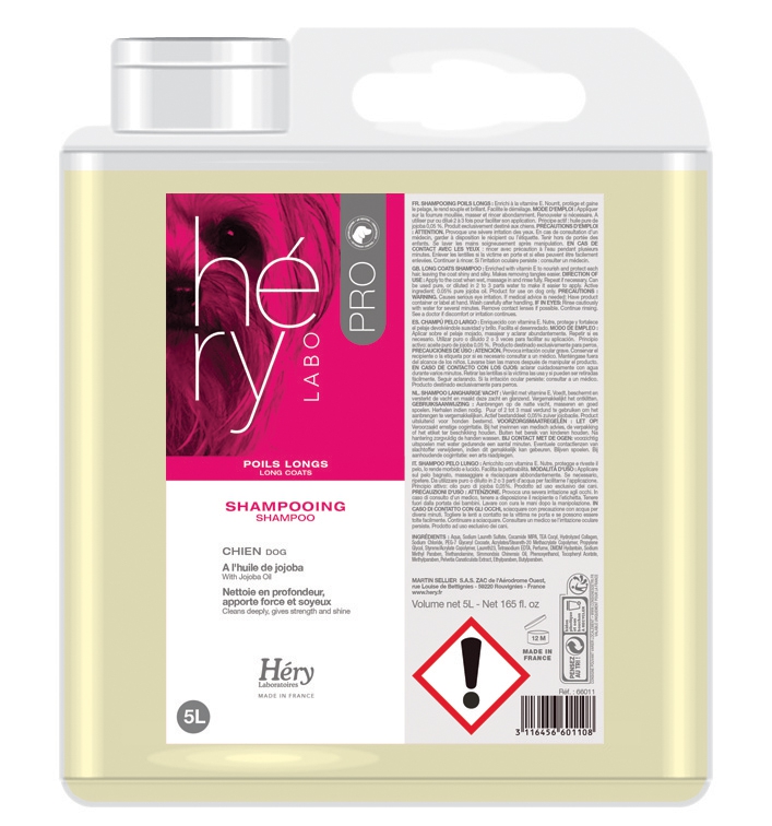 Shampooing pour Chien Poils Longs, Héry nettoie en profondeur, apporte force et soyeux. A l'huile de Jojoba.