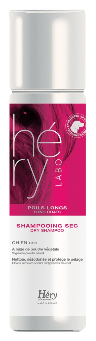 Shampooing sec Héry Poils Longs pour chien, nettoie, désodorise et protège le pelage. Formule à base de poudre végétale.