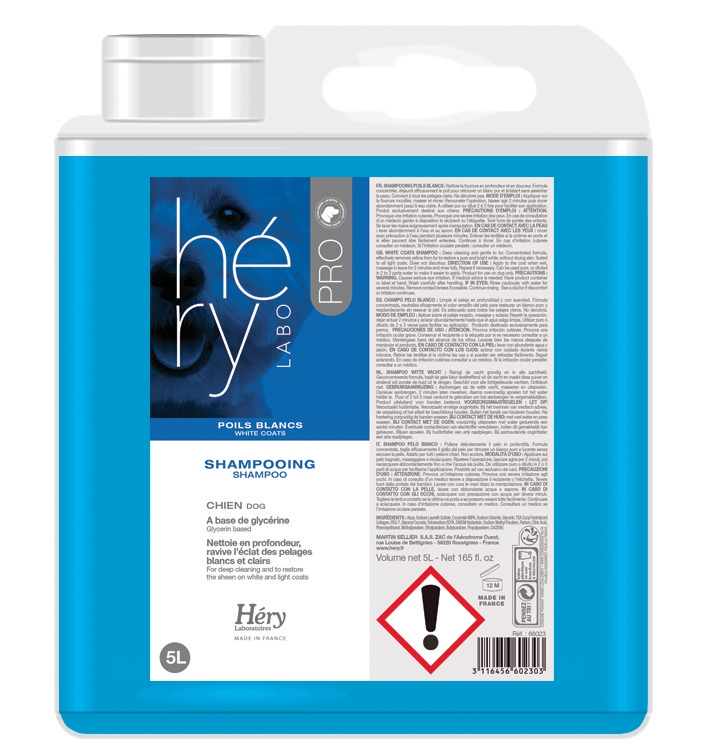 Shampooing pour Chien, Poils Blancs, Héry. Nettoie en profondeur, ravive l'éclat des pelages blancs et clairs. Aux protéines de soie.
