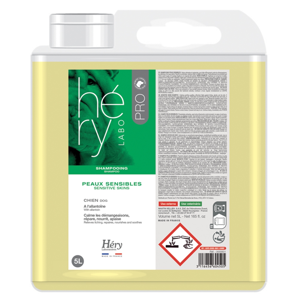 Shampooing pour Chien, Peaux sensibles, Héry. Calme les démangeaisons, répare, nourrit et apaise. A l'allantoïne.