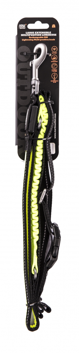 Laisse lumineuse extensible. Rechargeable via câble USB inclus. Ajustable à la ceinture.