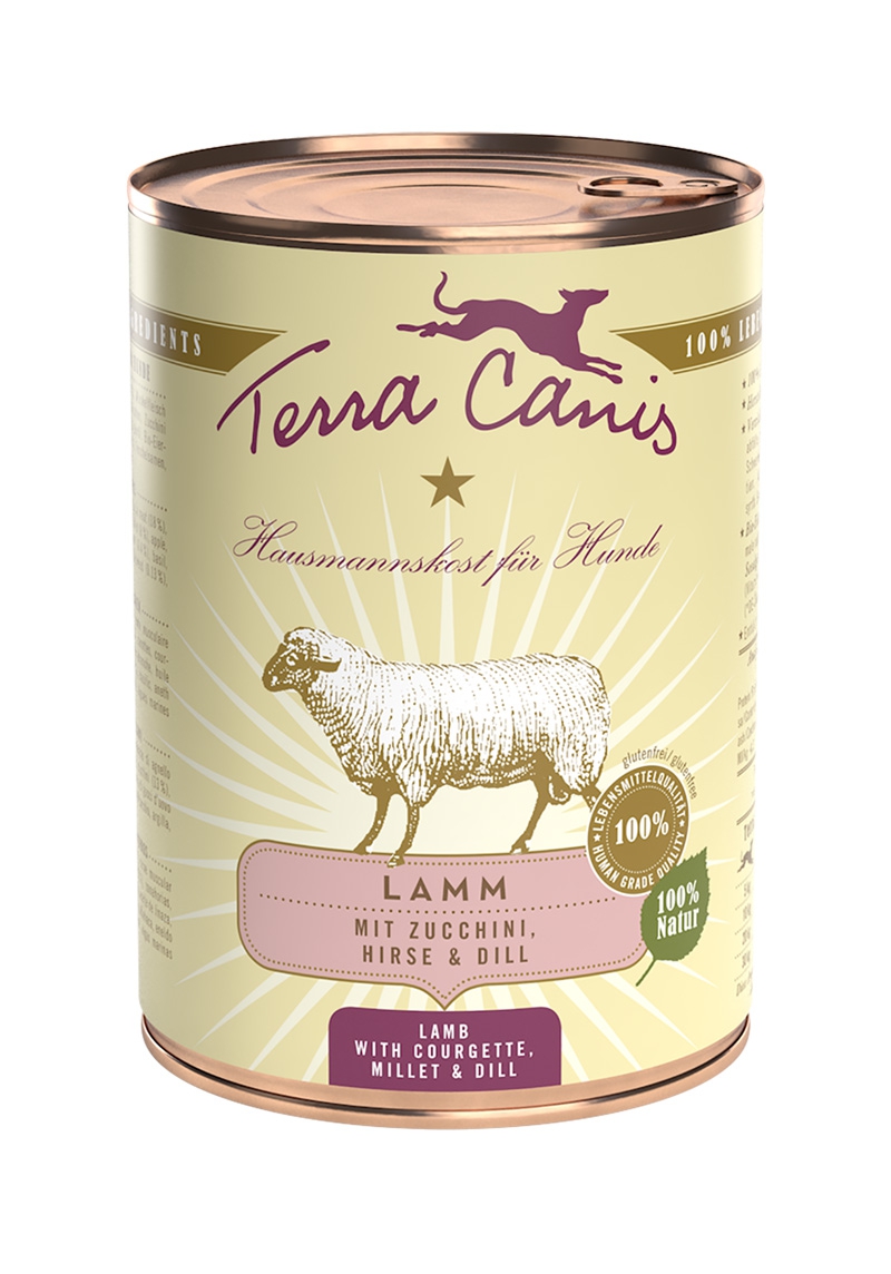 coeur d’agneau (35%), courgette (13%), poumon d’agneau (11 %), carotte, millet (8%), pomme, céleribranche, huile de lin, levure de bière, poudre de coquille d’oeuf, basilic, aneth (0,2%), graine de fenouil, algue marine (0,13%), argile, pollen de fleurs