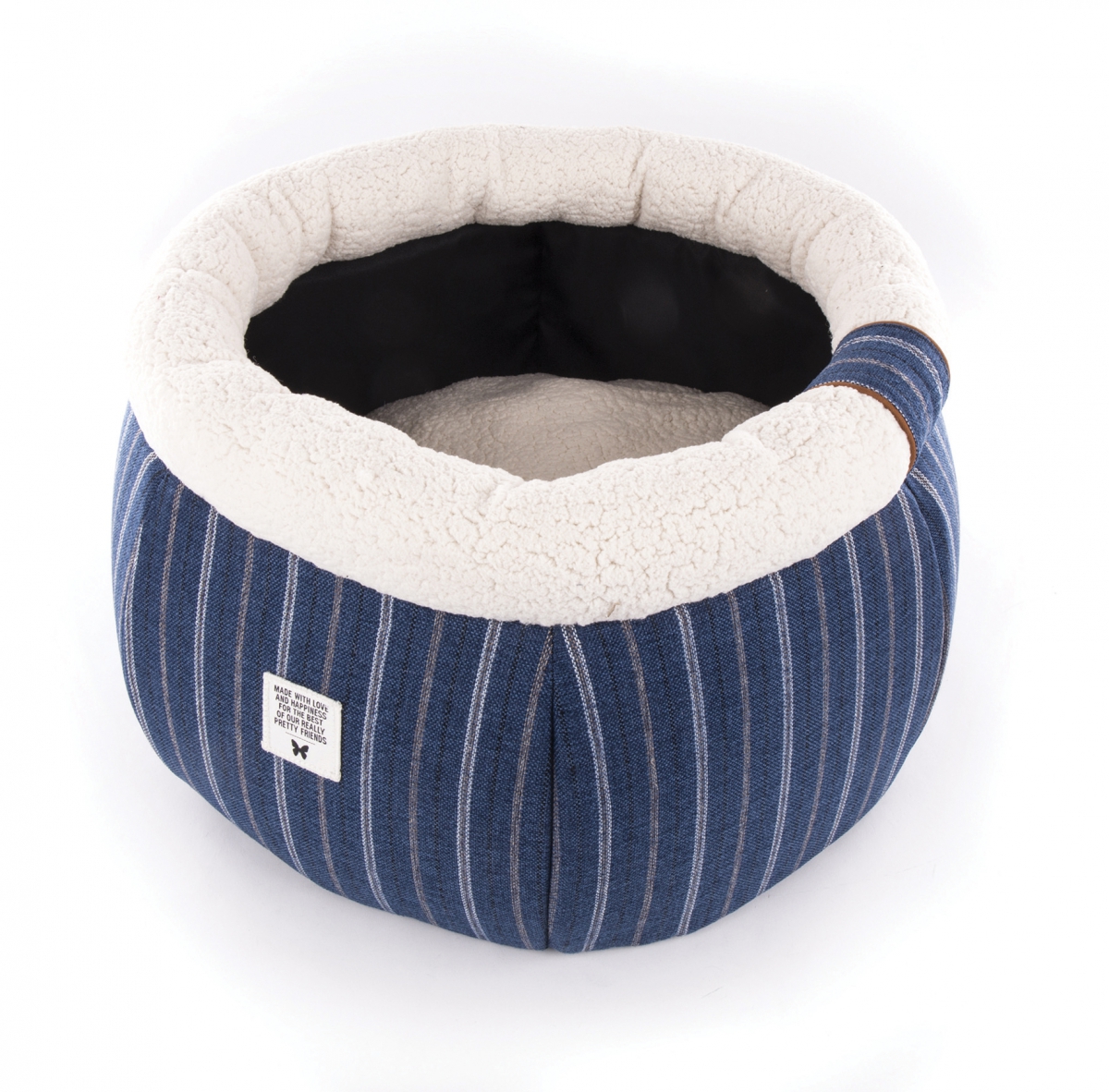 Corbeille haute (2 tailles) : forme vraiment très haute et très enveloppante, un vrai refuge pour les chats & les petits chiens. Coussin bien moelleux et amovible, une face en fourrure et l’autre en tissu rayé.