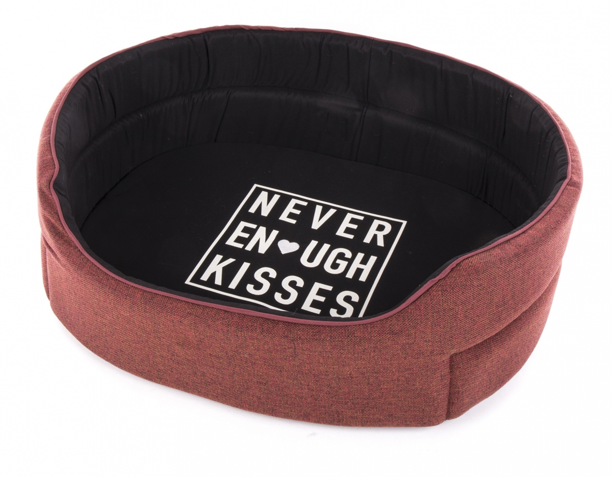Un grand print en aplat et une broderie en forme de coeur pour déclarerson amour à son chat ou à son chien : ‘’Never enough kisses’’… Jamais assez de baisers... Un choix de matières audacieux avec un vrai tissu d’ameublement, robuste, bien épais et avec un effet lainage.