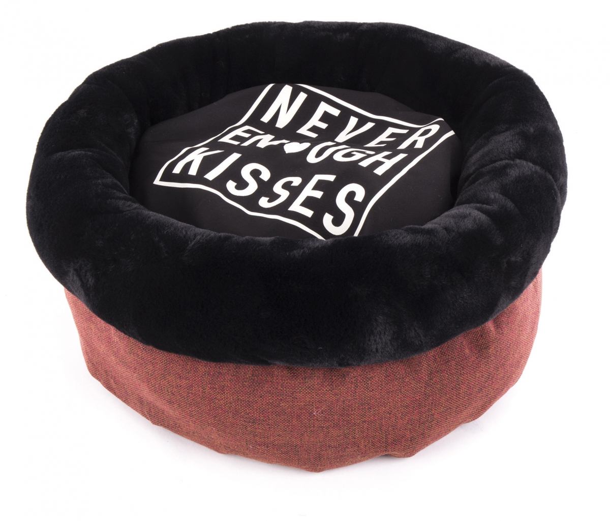 Un grand print en aplat et une broderie en forme de coeur pour déclarerson amour à son chat ou à son chien : ‘’Never enough kisses’’… Jamais assez de baisers... Un choix de matières audacieux avec un vrai tissu d’ameublement, robuste, bien épais et avec un effet lainage.