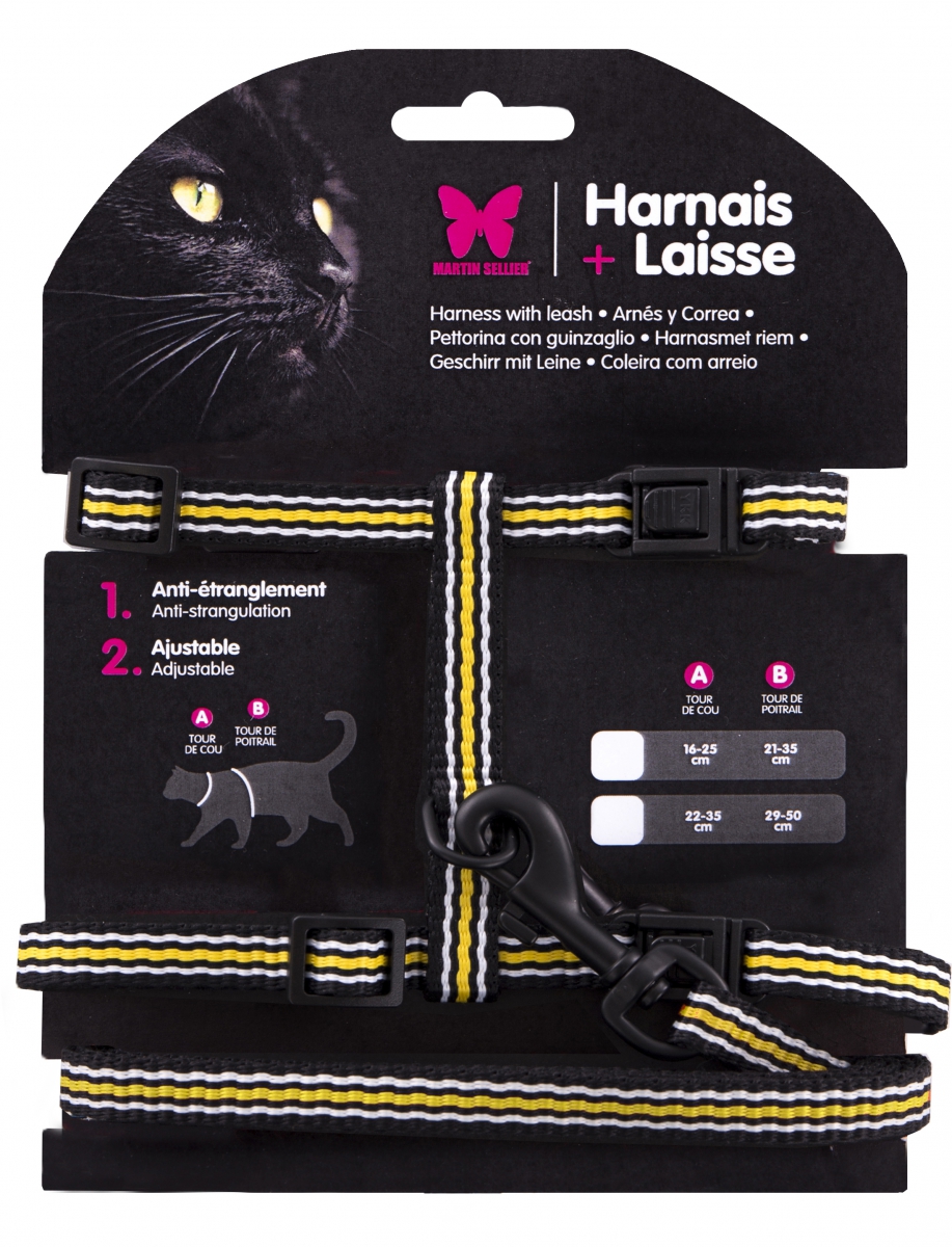 Harnais réglable avec une boucle anti-étranglement. Motifs rayures tricolores