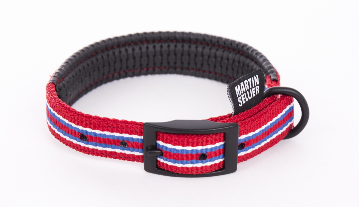 La collection TRIO: classique et chic avec ses rayures tricolore indémodable. Collier chat avec grelot, boucle anti-étranglement et accessoires noirs mats. Coloris: rouge, bleu, blanc.