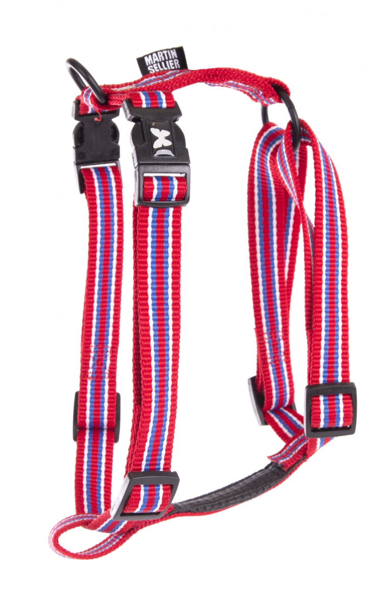La collection TRIO: classique et chic avec ses rayures tricolore indémodable. Harnais confort avec 2 boucles rapides. Accessoires noirs mats. Coloris: rouge, bleu, blanc.