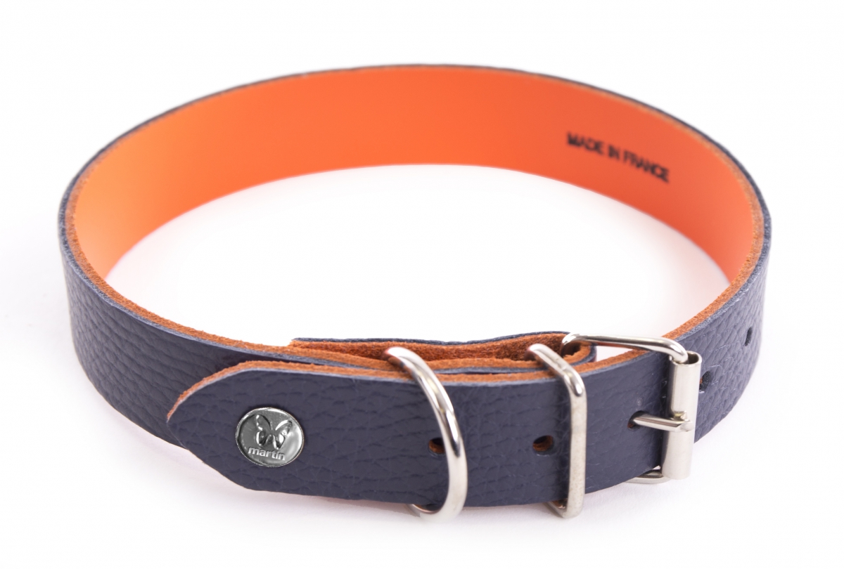 Collier cuir Allure Martin Sellier. Face extérieure est en cuir grainé et la face intérieure en cuir lisse. Effet bicolore vitaminé. Marquage Martin Sellier.