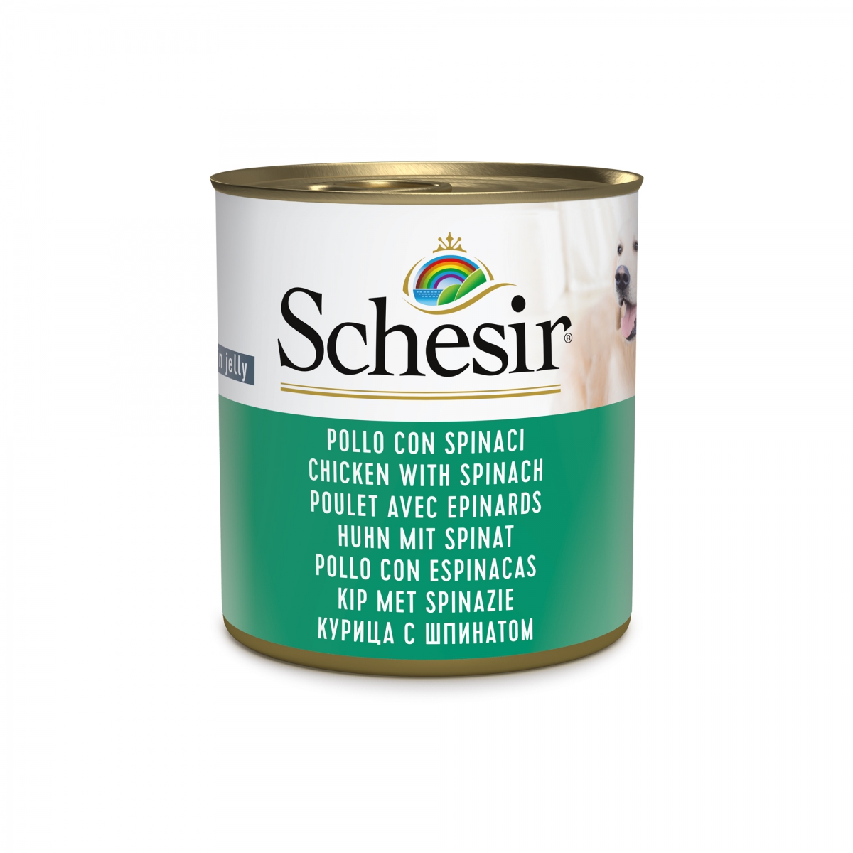 Aliment naturel complémentaire pour chien adulte, en gelée - boite de 285g SCHESIR La recette est à base de poulet, accompagné d'une garniture d’épinards savoureux, pour un repas appétissant et original, préparé dans une gelée alléchante.