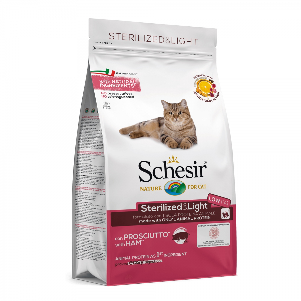 Aliment sec complet et équilibré pour chat adulte stérilisé, sac de 1,5kg SCHESIR Formulé avec une seule source de protéine animale (porc, dont 6% de jambon), qui est aussi l’ingrédient principal, c’est un aliment savoureux, complet, équilibré et facilement digestible, qui satisfait les exigences nutritionnelles des chats adultes stérilisés de toutes les races. Sa faible teneur en matières grasses et sa forte teneur en fibres favorisent le maintien du poids idéal du chat.