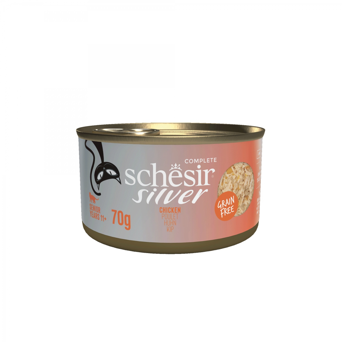 A partir de 11 ans, le chat a des besoins nutritionnels spécifiques liés à son âge et il est important que l'alimentation réponde à ces besoins. Schesir Silver est la ligne de recettes complètes et équilibrées pour les chats à partir de 11 ans, conçue pour soutenir le fonctionnement du système immunitaire. A base de protéines provenant de la vraie viande, combinées à d'autres ingrédients de valeur. Sans céréales.