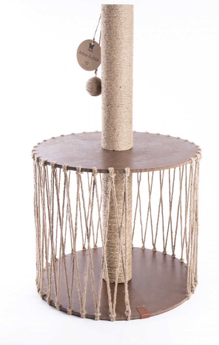 Les deux socles sont séparés par un poteau Papyrus de 40 cm et sont reliés entre-eux par des cordes, créant un espace cachette/ repos pour votre chat. Sur le haut de l’arbre, un poteau en Sisal avec une balle pour favoriser les moments de jeu.