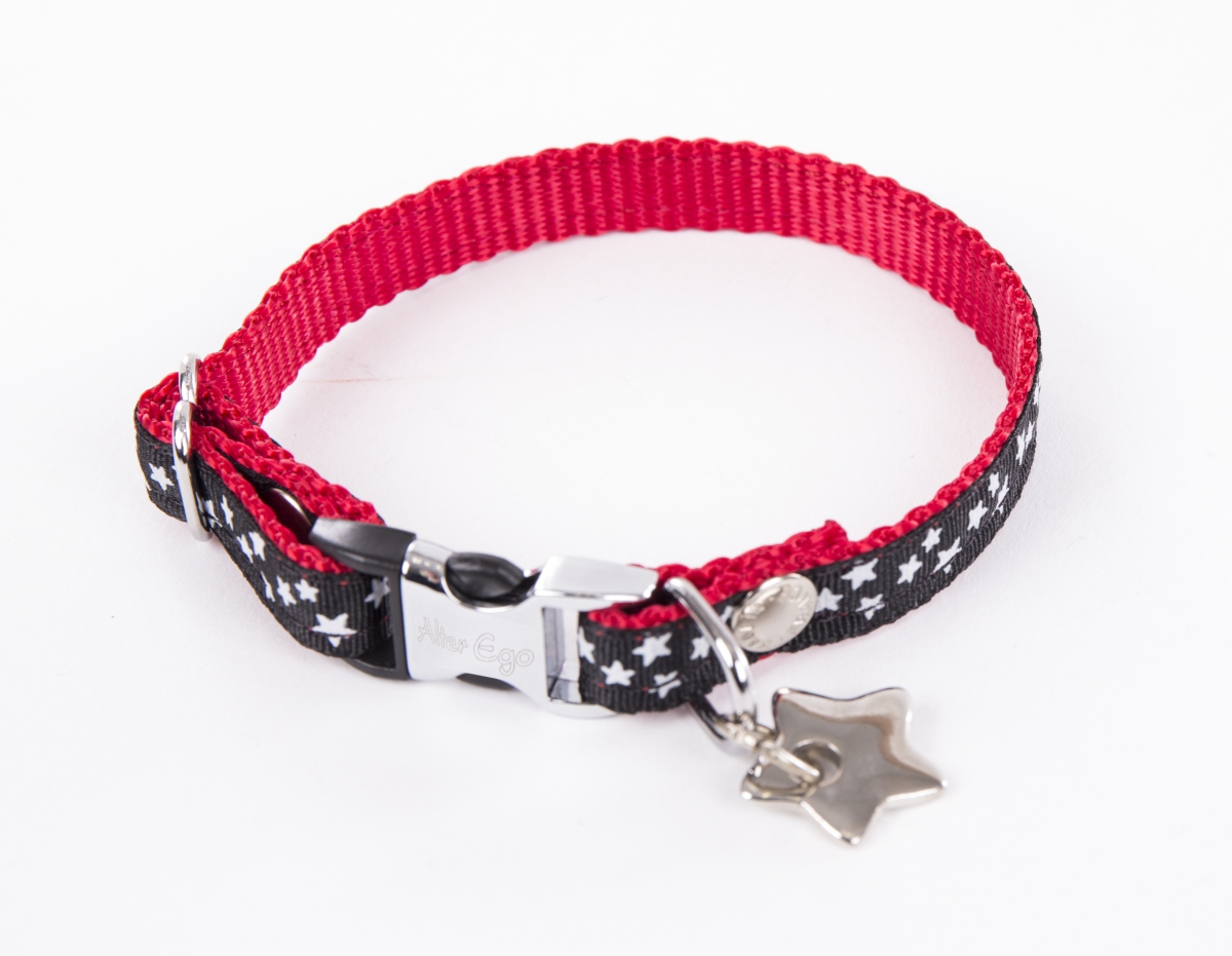 Découvrez le Collier pour chien Collection Étoile, l'accessoire parfait pour allier style et sécurité. Ce collier chic est orné de galons avec un motif étoilé cousu sur une sangle en nylon robuste, agrémenté de rivets double tête et d'une bouclerie auto-bloquante en métal durable. Le pendentif étoile ajoute une touche d'élégance.