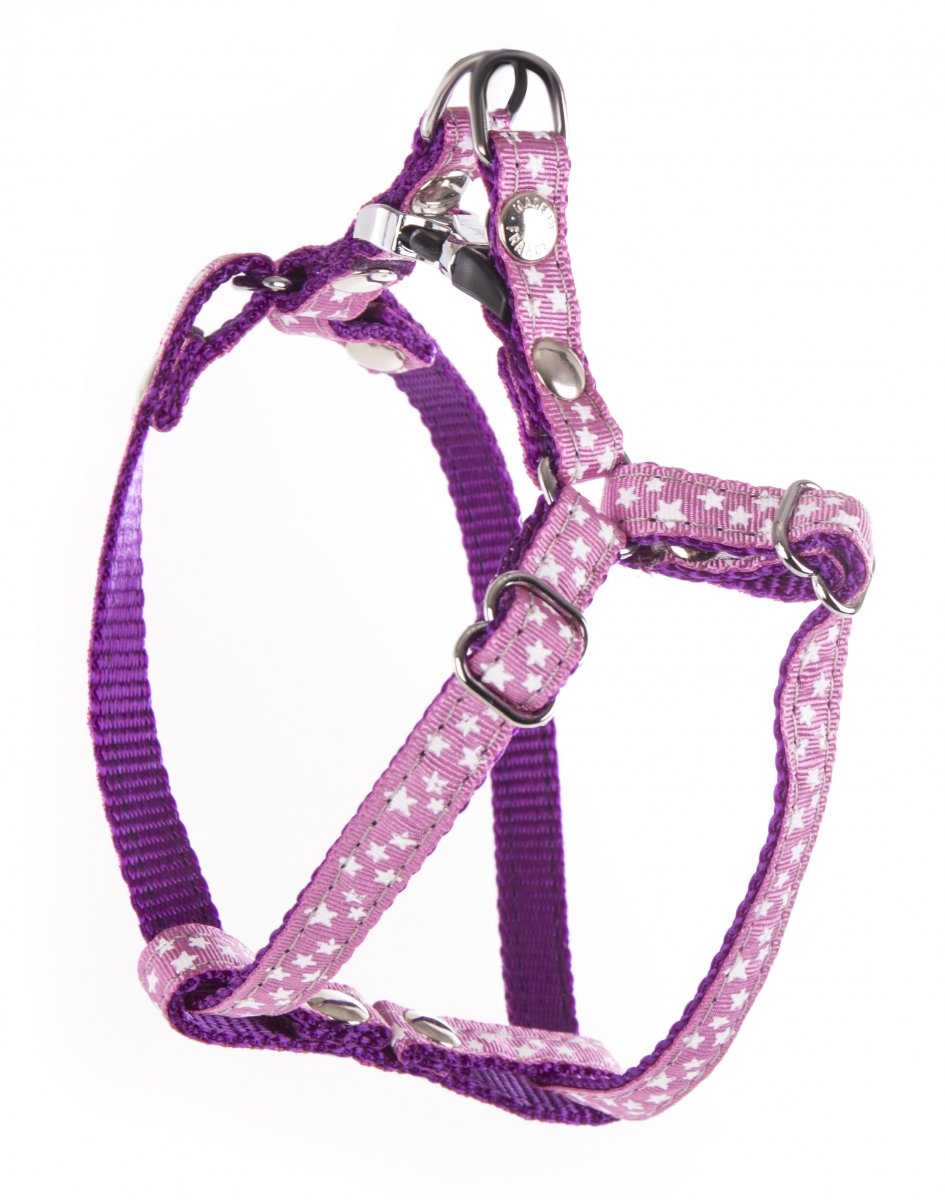 Découvrez le Harnais pour chien Collection Étoiles, l'accessoire parfait pour allier style et sécurité. Ce harnais chic est orné de galons avec un motif étoilé cousu sur une sangle en nylon robuste, agrémenté de rivets double tête et d'une bouclerie auto-bloquante en métal durable.