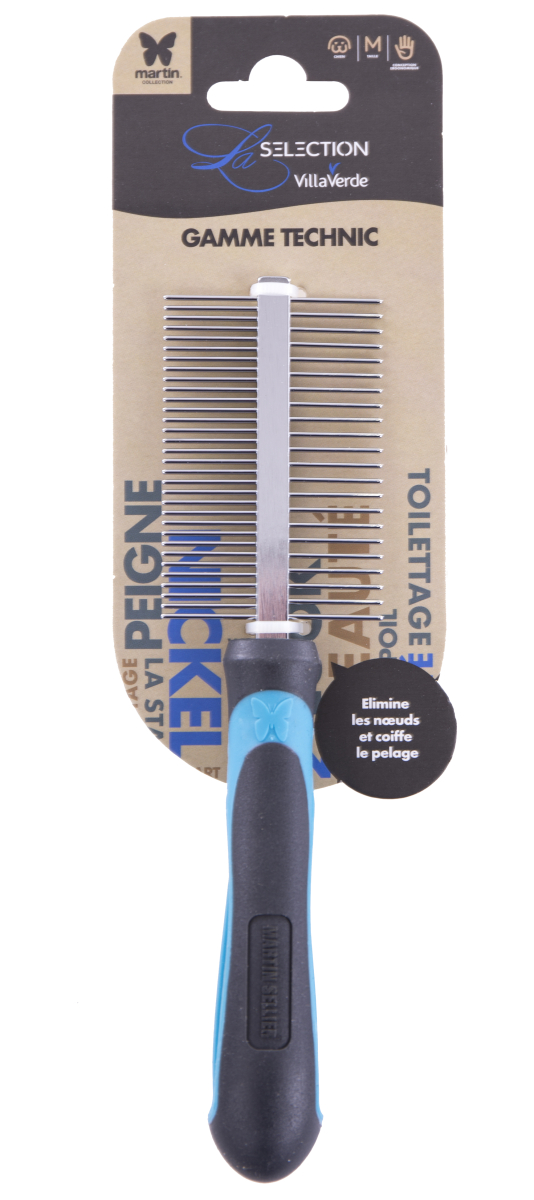 Le peigne double est un outil polyvalent pour le toilettage des chiens. Grâce à ses deux rangées de dents, il démêle, lisse et élimine efficacement les poils morts et impuretés, tout en respectant la peau de l’animal.