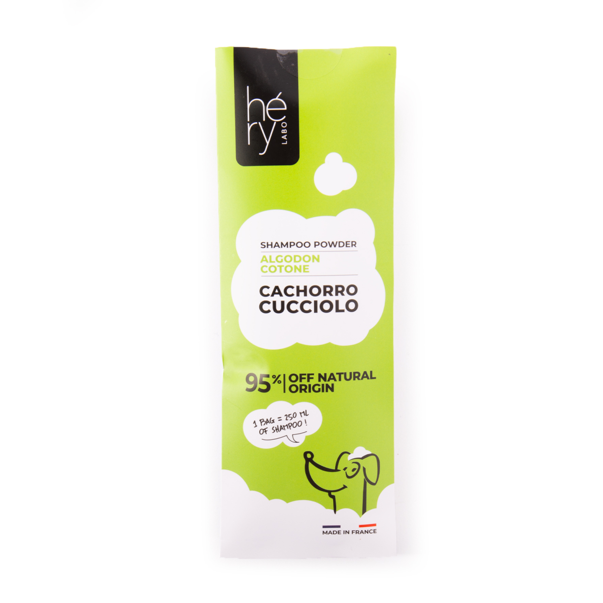 Shampooing poudre pour les chiots à diluer dans l'eau. A l'extrait naturel de coton pour apporter tendresse et douceur dès les premiers bains.