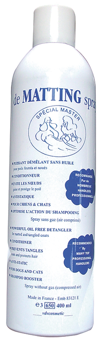 Le spray De Matting est un puissant démêlant sans huile. Conditionneur, évite les noeuds, antistatique et optimise l’action du shampooing. Recommandé pour chien et chat.