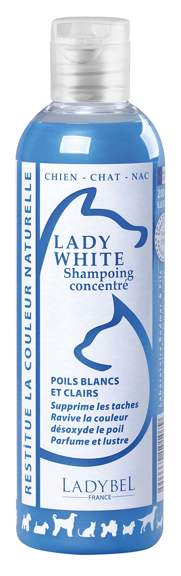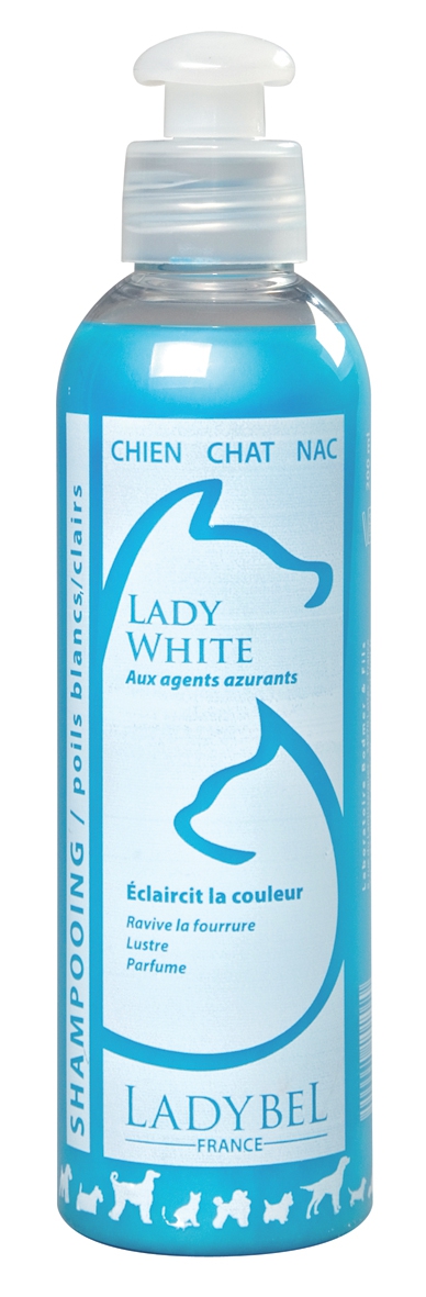 Le shampooing Lady White de la marque Lady Bell est un shampooing qui ravive la couleur, convient à tous les types de poils, désodorise et fait briller, favorise la pousse du poil et facilite le brushing. Le shampooing évite le jaunissement des fourrures blanches.