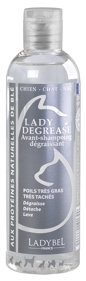 L'avant-Shampooing Lady Degrease, très concentré et protéiné dégraisse en profondeur les sécrétions de séborrhée ou les taches de graisse, goudron, et cambouis. Spécial poils très gras, très tachés.