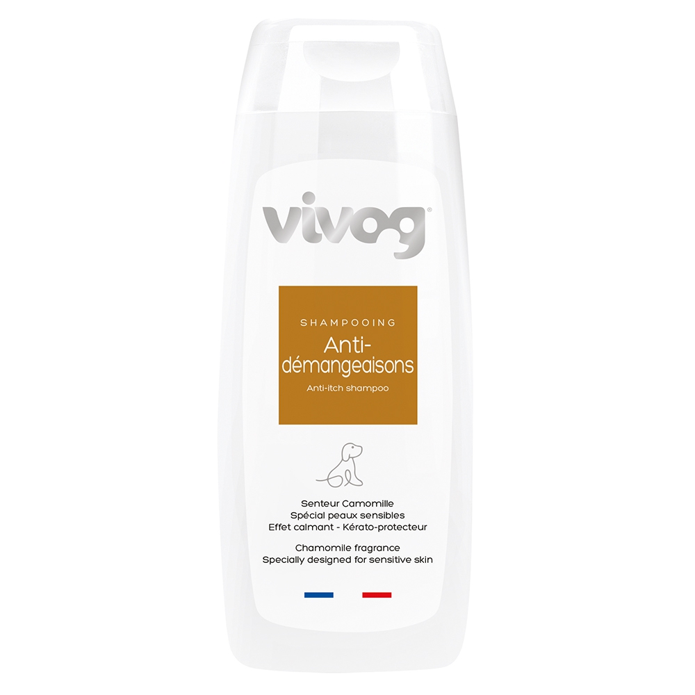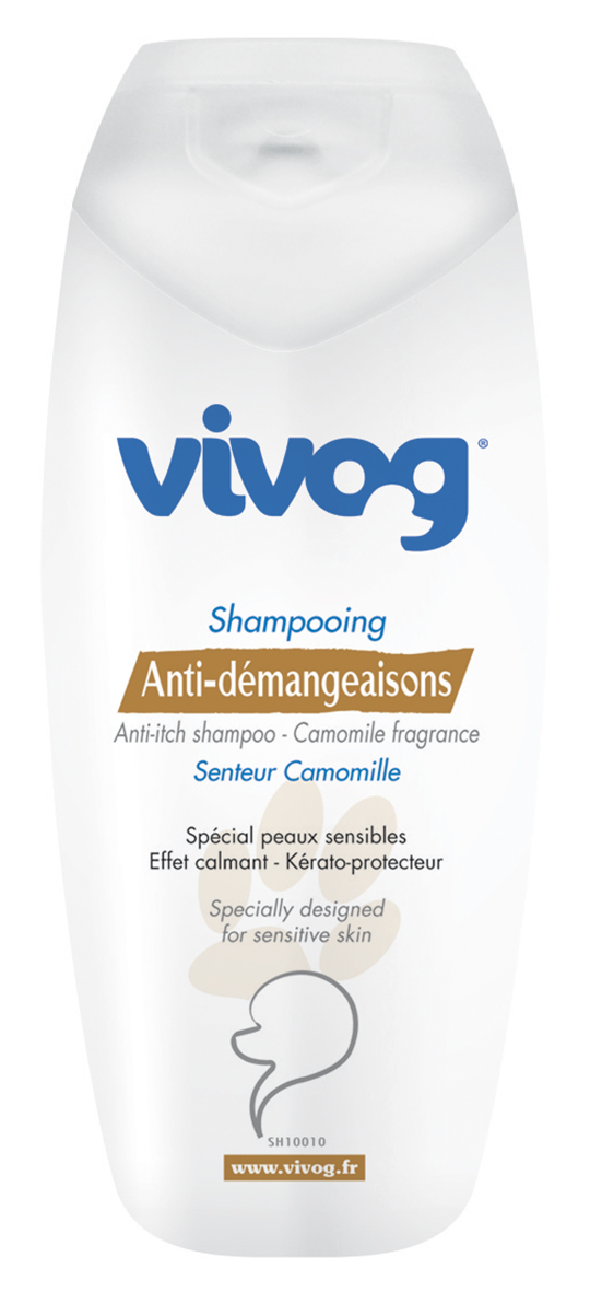 Le shampoing chien Vivog Anti-démangeaison est Kérato-protecteur. Effet calmant. Calme les démangeaisons. Sans paraben. A l'huile de camomille