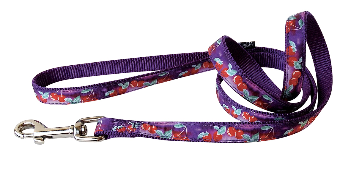Nylon fantaisie imprimé cerises, autre face unie. Collier et harnais réglable, avec attache rapide. Harnais avec attache double sécurité.