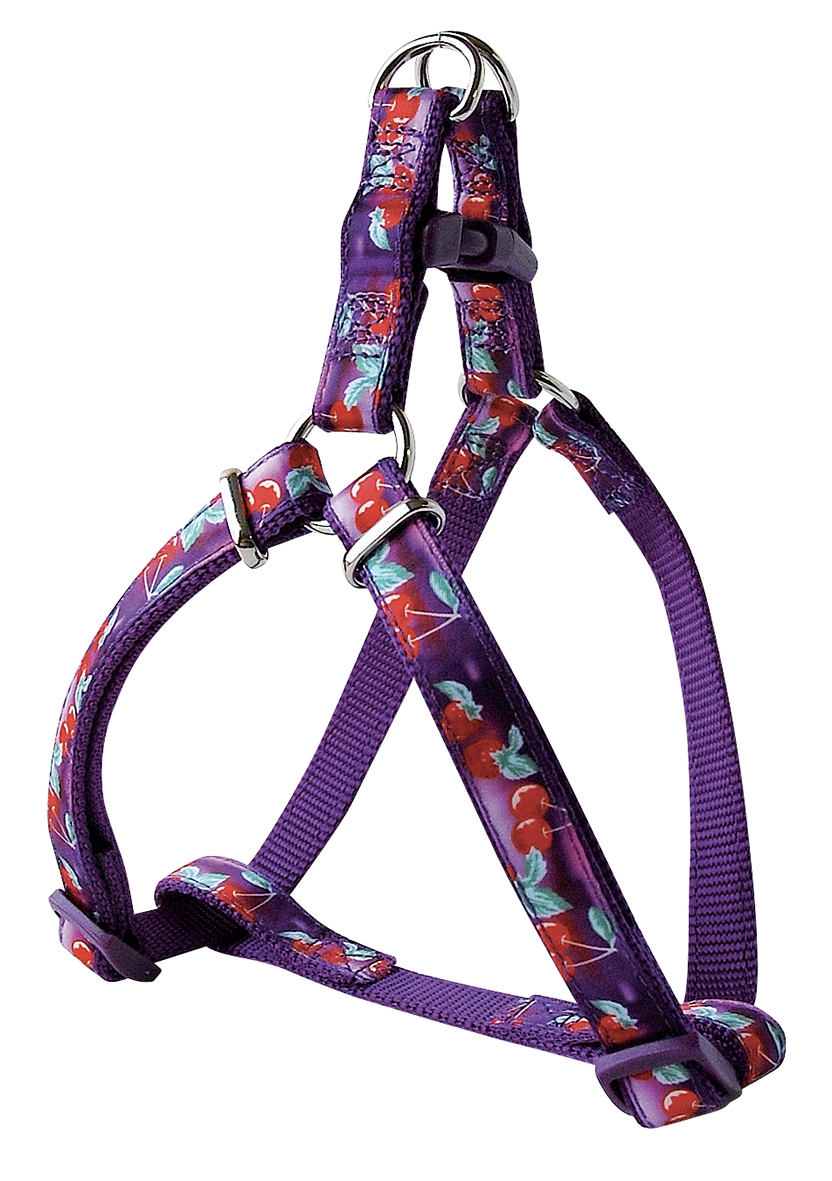 Nylon fantaisie imprimé cerises, autre face unie. Collier et harnais réglable, avec attache rapide. Harnais avec attache double sécurité.
