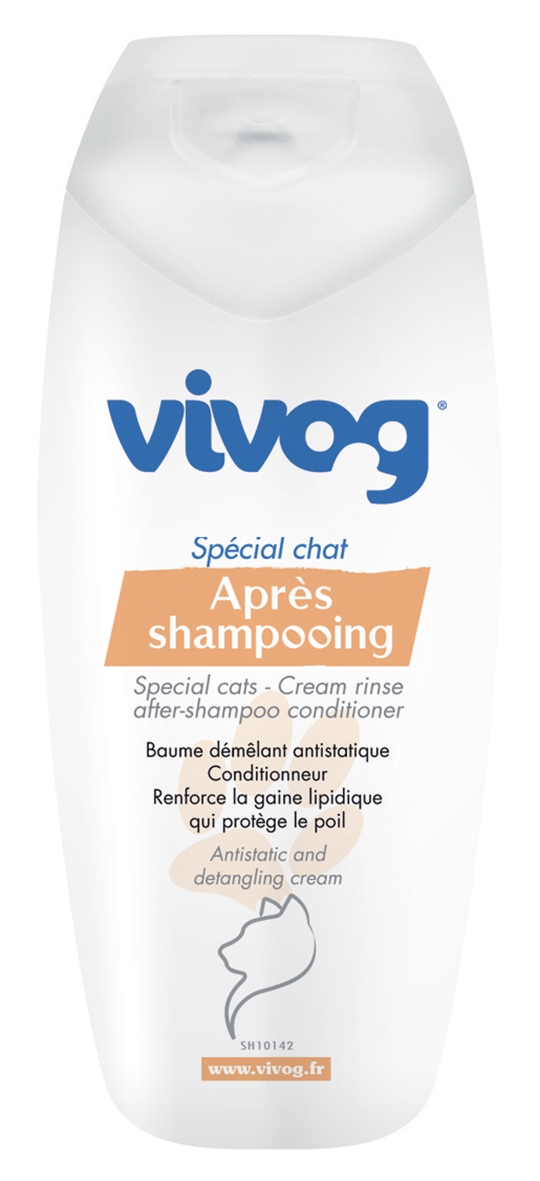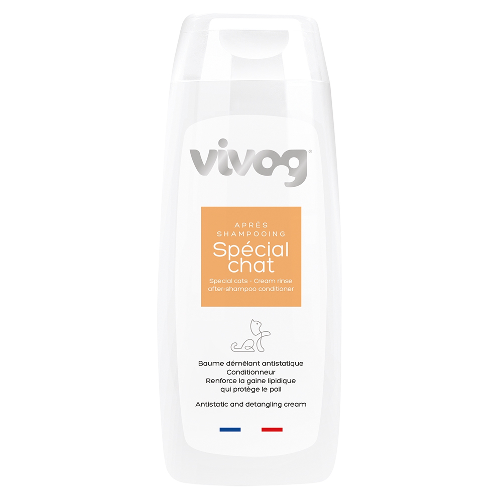 L'après-shampooing pour chat Vivog est antistatique. Conditionneur. Renforce la gaine lipidique et protège le poil. Sans paraben. A la cire d'abeille.
